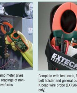 Data Hold To freeze the LCD reading, press the HOLD button. While data hold is active, the HOLD icon appears on the LCD. Press the HOLD button again to return to normal operation. Peak Hold The Peak Hold function captures the peak AC or DC voltage or current. The meter can capture negative or positive peaks as fast as 1 millisecond in duration. LCD Backlight Button The LCD is equipped with backlighting. Press the backlight button to turn the backlight on. Press again to turn the backlight off. Automatic Power OFF In order to conserve battery life, the meter will automatically turn off after approximately 25 minutes. To turn the meter on again, turn the function switch to the OFF position and then to the desired function position Additional features of the Extech EX720 clamp meter include: diode test, audible continuity beeper, Data Hold, Auto Power Off, and a Fast Peak Hold that captures inrush currents and transients. Extech EX720 clamp meters come complete with test leads, 9V battery, and a belt holster. A Type K bead wire temperature probe (-20 to 250°C) is also included.